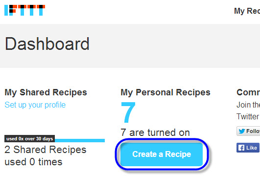 2. 成功登录会进入叫做 dashboard 的页面,这里是个人主页,包含已共享任务、私有任务、IFTTT 社区和邀请好友四个部分。点击 “Create a Recipe” 就可以新建一个任务: