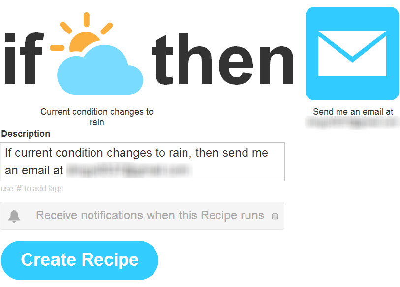 8. 至此,点击 “Create Recipe” 就可以在以后当地将要下雨时得到邮件通知。IFTTT 的天气检测时间为未来 24 小时,完全不存在雨点砸下来时才收到邮件的尴尬……